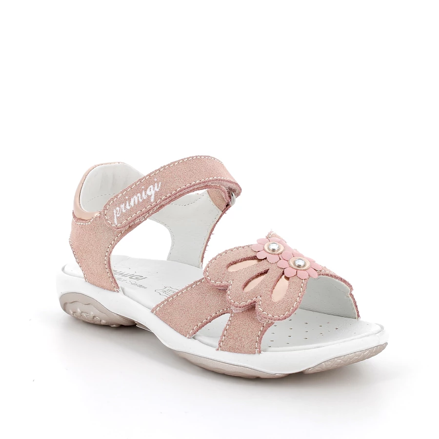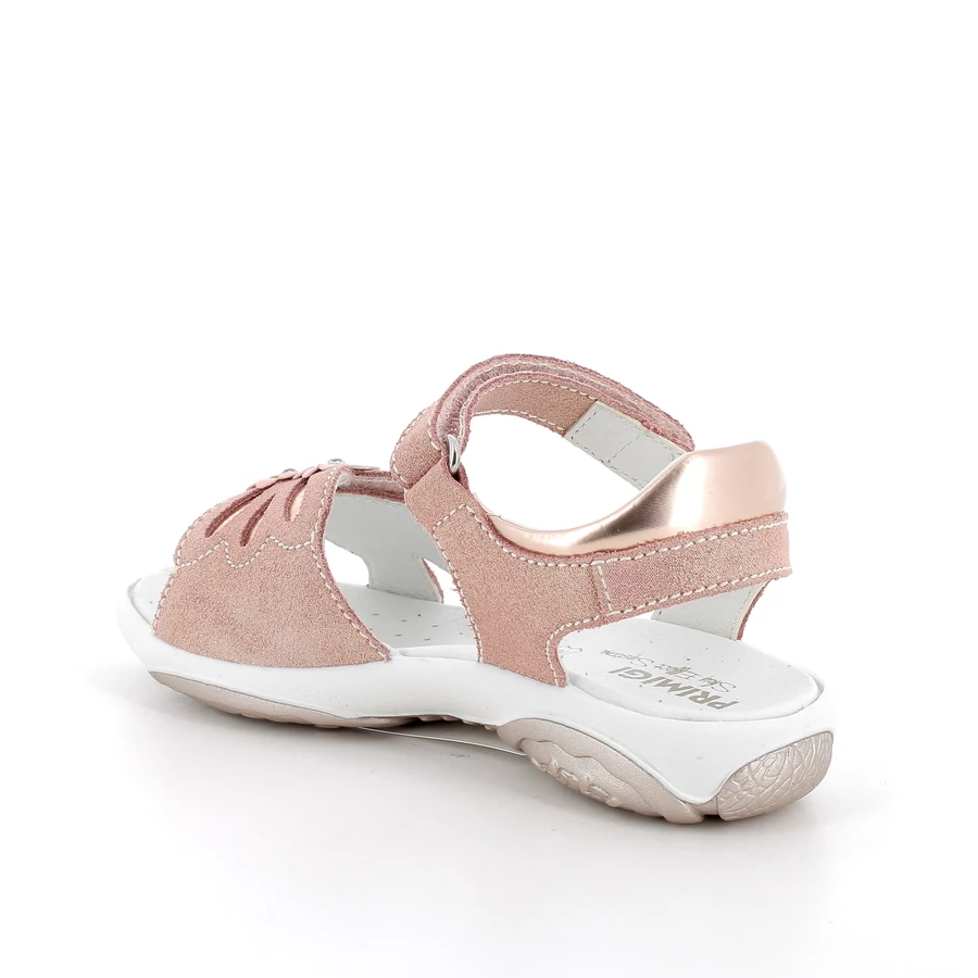 Lányka szandál, különféle alkalomra alkalmas. Az elülső sávon virág alakú applikáció található apró központi részletekkel, amelyek játékos és nőies megjelenést kölcsönöznek. A szandál szerkezete két tépőzáras záródást tartalmaz, egyet a bokánál és egyet a lábfejnél. A talp ergonomikus és csúszásmentes, enyhén kontúrozott formával, hogy alkalmazkodjon a láb természetes mozgásához és stabilitást biztosítson.